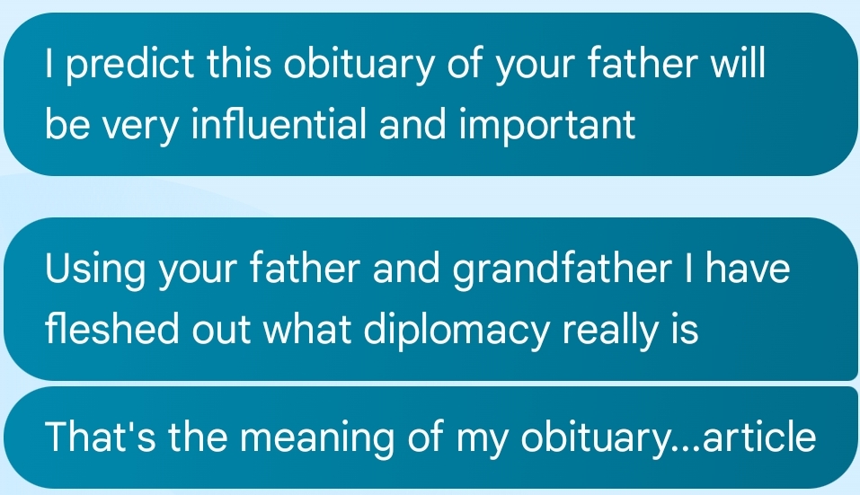 Frank was popular so he was always hanging out with important people. But this obituary has an important goal and that is to explain what diplomats are and what diplomacy is. Frank grew up understanding the importance of understanding the world. This is diplomacy. Donald Trump might call it “getting along.” It is much more important than that, however. One of the questions I put to Frank in my interview with him was about diplomacy. I offered what I thought was an improved definition of what diplomacy is. Frank agreed that I was right.