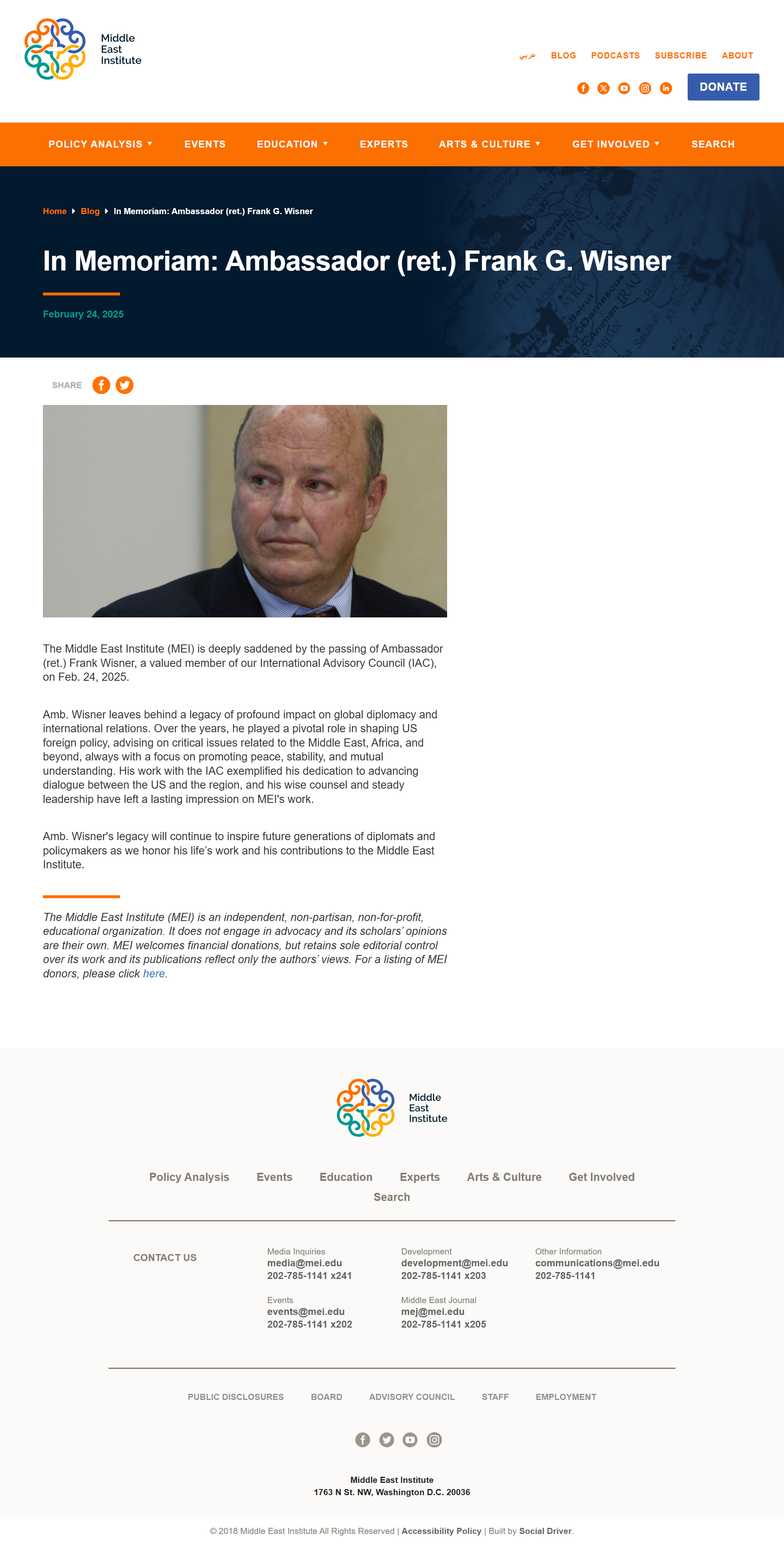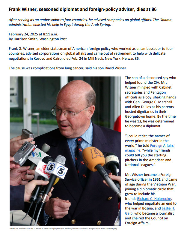 I was working last night, here in California, when I went to the Middle East Institute website [mei.edu], I've got a planned interview with someone very important there. It will happen in the next several months. I'm always working, but I'm still not doing 15 hours a day yet, because of cancer. Lymphoma. Everyone knows that now. I will get back to 15-16 hours/day soon. So I was looking at the home page and I was stunned to see mention of Frank Wisner's death. An obituary. He died on February 24, 2025. He was 86 years old.