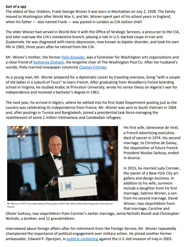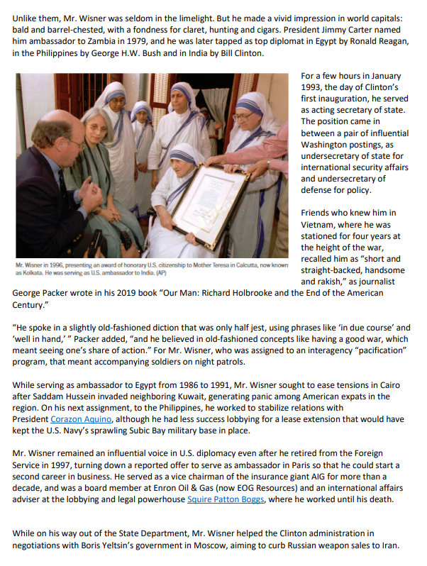 To get the details of Frank's career as a diplomat I recommend you read his obituaries on the net or his Wikipedia page, which I have published below. Listen to the interview I did with him. Just put his name “Wisner” in my search engine: worldaffairsmonthly.com.