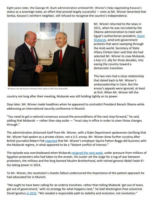 [March 1, 2025: I just communicated this morning with one of Wisner's children. They told me their father did not work for the CIA, that he really was State Department. "Thanks the only thing is insinuating that my father worked for the CIA would infuriate him -- he was clear his whole career these things were separate and would undermine all the work he did. If you feel that is wrong I am not fussed by leaving it as is, but it is not correct," they texted me. I replied: "I knew that would outrage him....etc. I will clarify but most everyone will and would assume he was CIA. That's the way the national security state works." They replied: "Well, he was not -- he collaborated with them for certain but he was not CIA." I replied: "He is inevitably linked with his father....that's what I had to accept." "That's totally fair," they texted in reply. I will add here that the CIA has many heads of state on their payroll, and Hosni Mubarak was one promiment example. That Frank Wisner handled him is the problem I faced in writing this up. Cutting off this CIA payroll pipeline would result in the toppling of all the Israeli-controlled Arab dictators.]