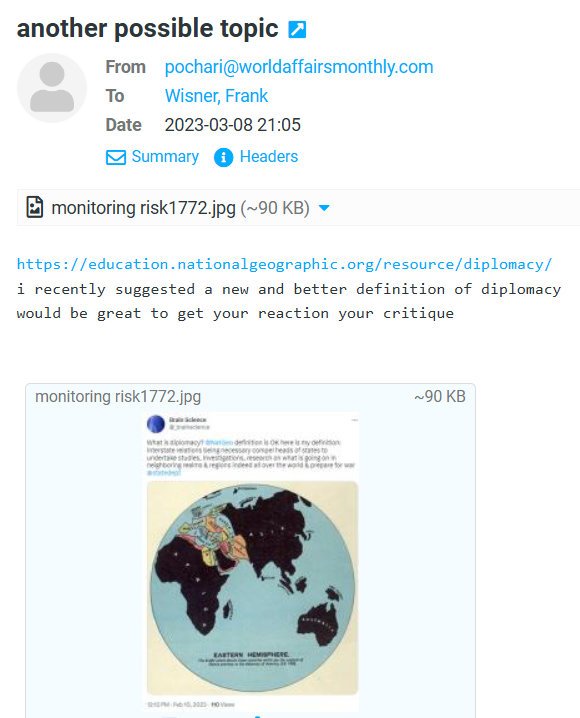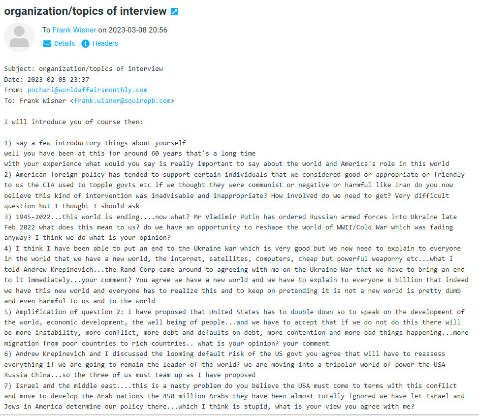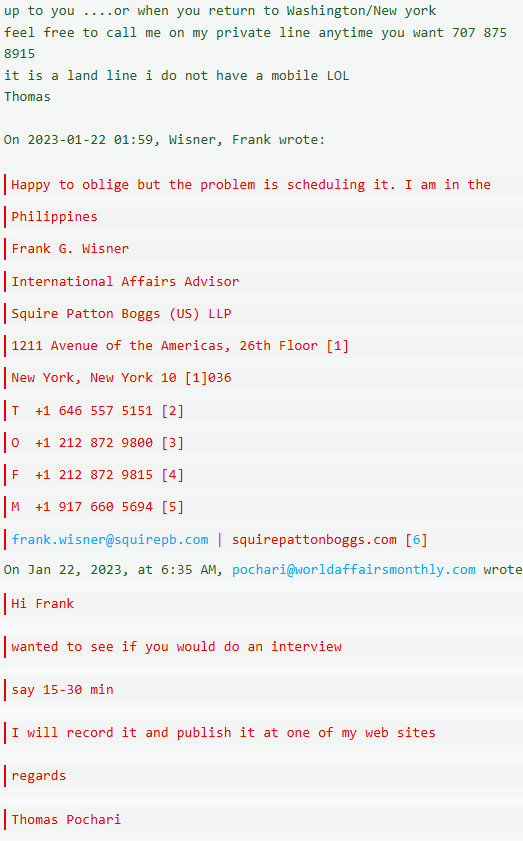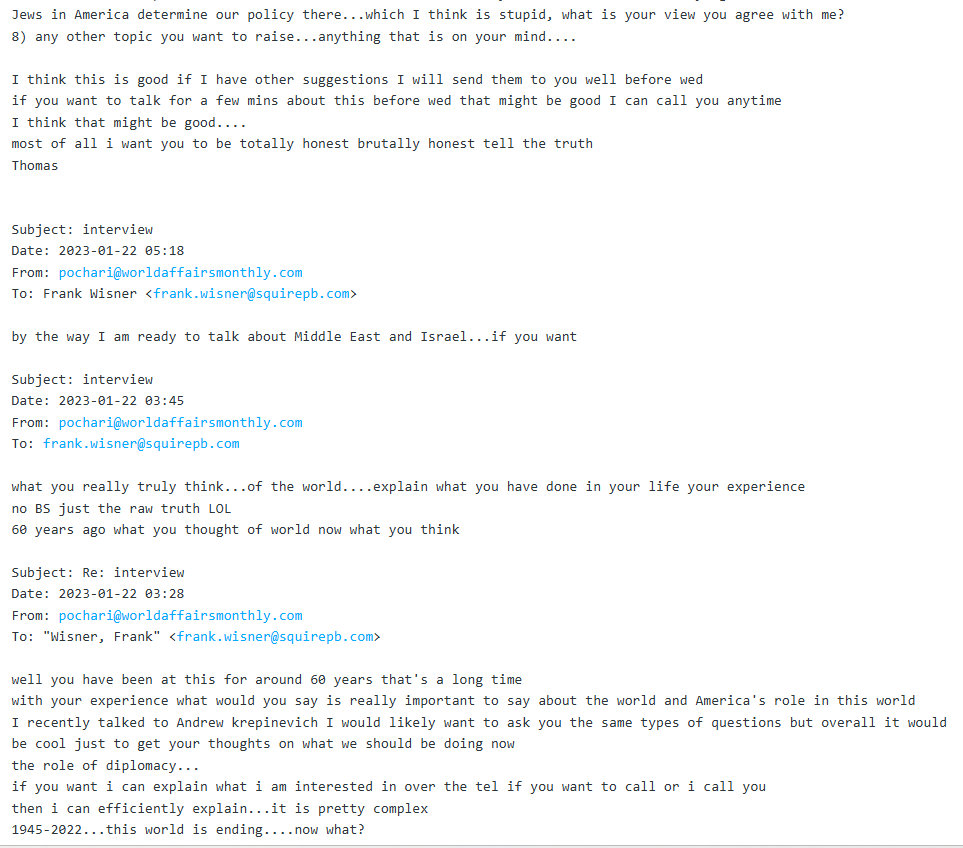 A pain went through my body – I'm not exaggerating. He was certainly famous when I did an interview with him in March 2023. But this interview – done in 2 parts – made him really famous. It's likely most everyone was amazed at how good the interview was, how Wisner did a really cool job. He did ask for questions in advance, and I was not opposed to that. So I sent him questions. Frank was famous because of his father. His father, with the same name, was one of the founders of the Central Intelligence Agency. I really don't know if Frank G. Wisner worked for the CIA like his father, he was a foreign service officer in the State Department, becoming a “career ambassador” and respected at the highest levels of the US government for decades and decades. I'm guessing that he really he worked for the CIA.