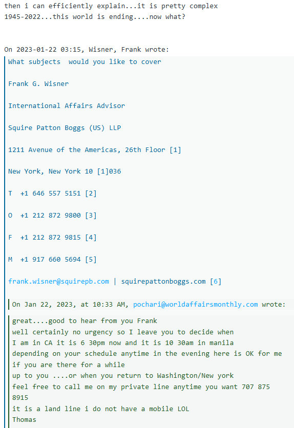 Everyone thinks of spies when they hear CIA. Yet this is very misleading. Frank Wisner and his son were definitely cold warriors and they both realized that the United States of America must not get too complacent. I do not remember when Frank and I first got acquainted. I'm thinking it was about 17-18 years ago, probably around then. I was always very busy, and I was always somewhat skeptical of “American diplomacy” – I'm sorry to say that. But Frank was really extraordinary. He was so sincere, he was totally dedicated to understanding the world. We bonded right away. But it was an occasional friendship early on, it only got more intense since 2022 or so. This is when I was relaunching my media business. WAM media, I call it, with 5 websites.