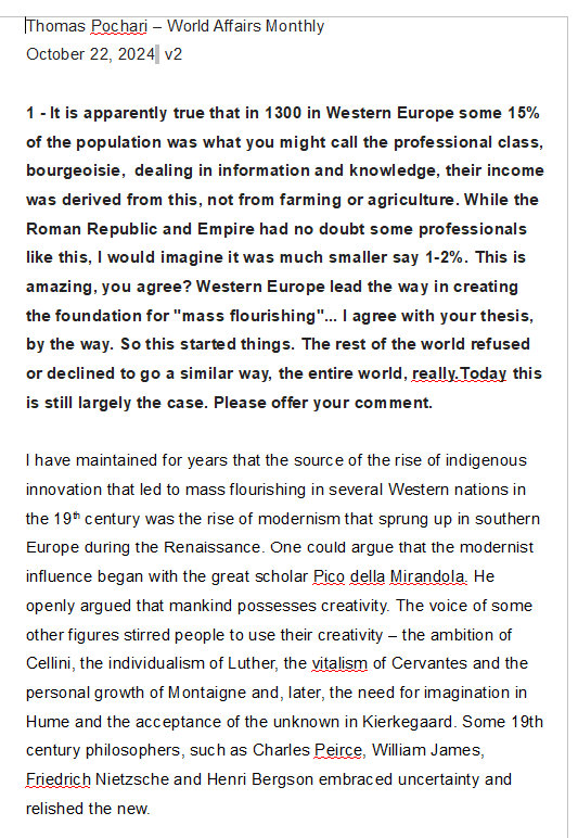 1 - It is apparently true that in 1300 in Western Europe some 15% of the population was what you might call the professional class, bourgeoisie, dealing in information and knowledge, their income was derived from this, not from farming or agriculture. While the Roman Republic and Empire had no doubt some professionals like this, I would imagine it was much smaller, say 1-2%. This is amazing, you agree? Western Europe led the way in creating the foundation for "mass flourishing"... I agree with your thesis, by the way. So this started things. The rest of the world refused or declined to go a similar way, the entire world, really. Today this is still largely the case. Please offer your comment.