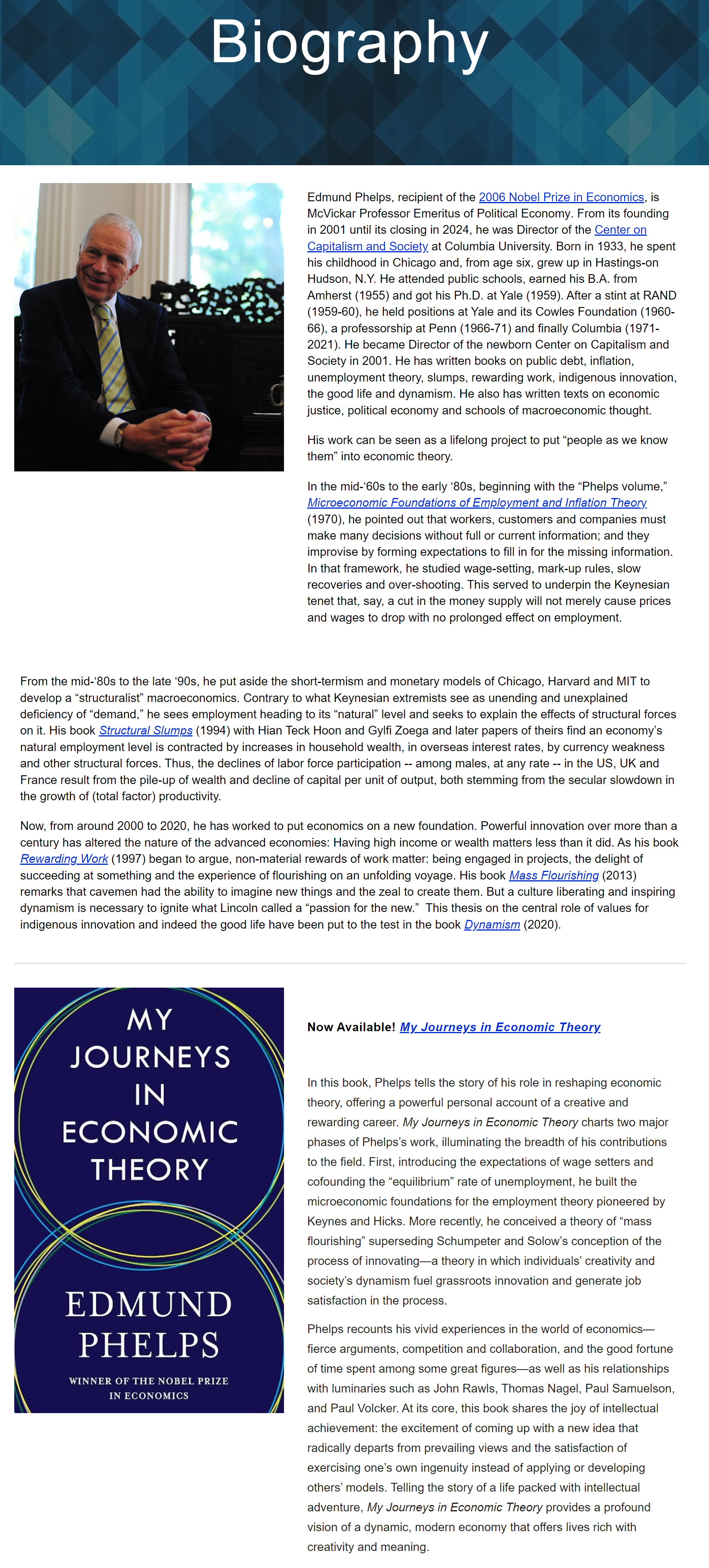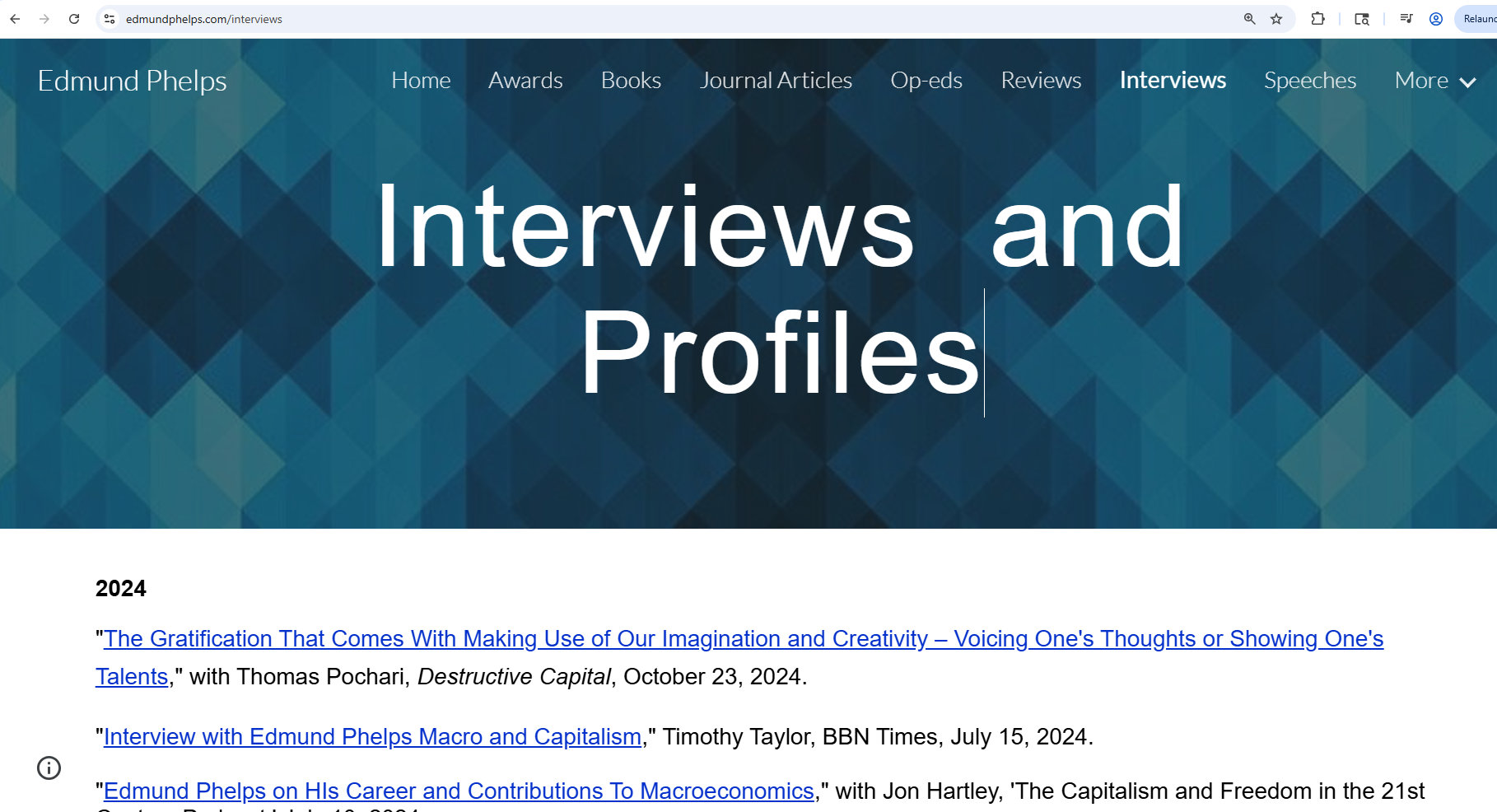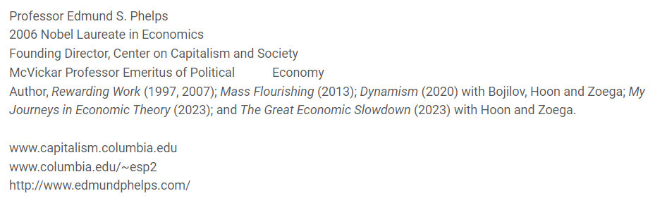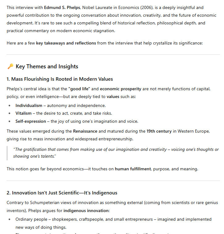 This interview with Edmund S. Phelps, Nobel Laureate in Economics (2006), is a deeply insightful and powerful contribution to the ongoing conversation about innovation, creativity, and the future of economic development. It’s rare to see such a compelling blend of historical reflection, philosophical depth, and practical commentary on modern economic stagnation.
