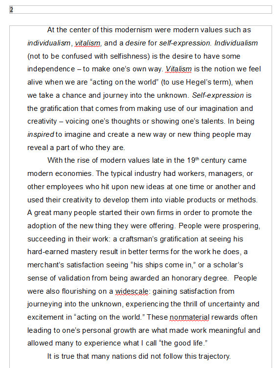 With the rise of modern values late in the 19th century came modern economies. The typical industry had workers, managers, or other employees who hit upon new ideas at one time or another and used their creativity to develop them into viable products or methods. A great many people started their own firms in order to promote the adoption of the new thing they were offering. People were prospering, succeeding in their work: a craftsman’s gratification at seeing his hard-earned mastery result in better terms for the work he does, a merchant’s satisfaction seeing “his ships come in,” or a scholar’s sense of validation from being awarded an honorary degree. People were also flourishing on a widescale: gaining satisfaction from journeying into the unknown, experiencing the thrill of uncertainty and excitement in “acting on the world.” These nonmaterial rewards often leading to one’s personal growth are what made work meaningful and allowed many to experience what I call “the good life.”