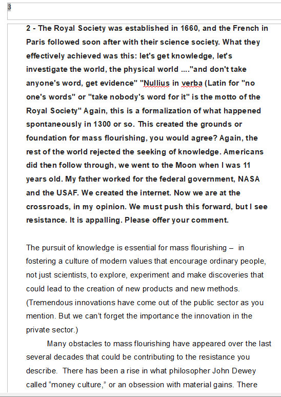 2 - The Royal Society was established in 1660, and the French in Paris followed soon after with their science society. What they effectively achieved was this: let's get knowledge, let's investigate the world, the physical world ...."and don't take anyone's word, get evidence"; "Nullius in verba (Latin for "no one's words" or "take nobody's word for it") is the motto of the Royal Society." Again, this is a formalization of what happened spontaneously in 1300 or so. This created the grounds or foundation for mass flourishing, you would agree? Again, the rest of the world rejected the seeking of knowledge. Americans did then follow through, we went to the Moon when I was 11 years old. My father worked for the federal government, NASA and the USAF. We created the internet. Now we are at the crossroads, in my opinion. We must push this forward, but I see resistance. It is appalling. Please offer your comment.