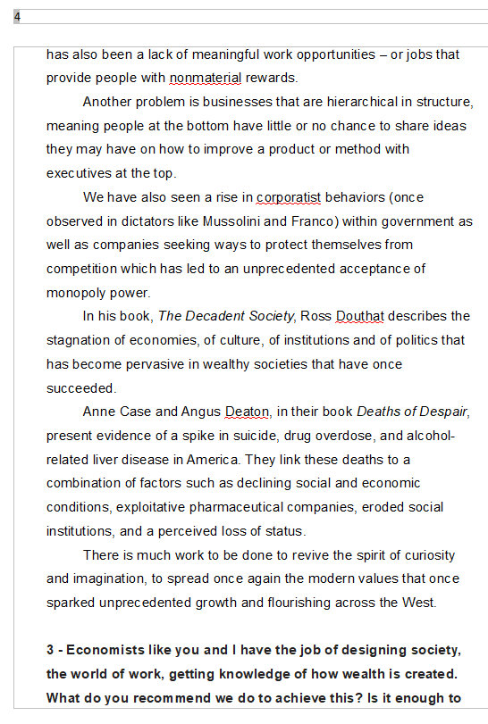 “Let me end by offering some thoughts on what sort of economy would offer the good life. History suggests it would be an economy full of entrepreneurial people – people alert to unnoticed opportunities, who search for better ways of doing things and exercise their initiative to try out new things. It would be an economy full of innovative people – people imagining new things, developing new concepts into commercial products and methods, and marketing them to potential. People would have opportunities for work that are interesting, engaging, and fun too. The innovation going on in the enterprise sector would be pervasive – across most industries – and inclusive, from the grassroots of society to the most advantaged. I envision an economy that is, in large part, a sprawling space with myriad studios for creating new things – an economy full of people in the business of creating.”