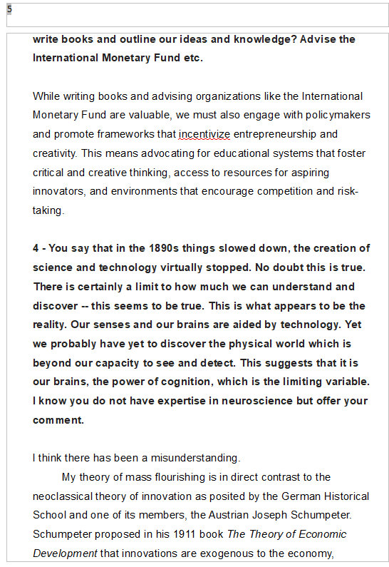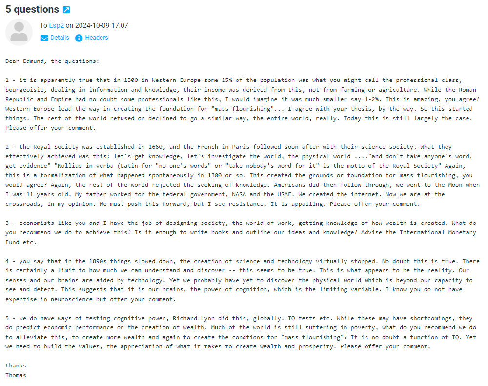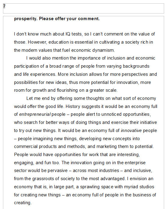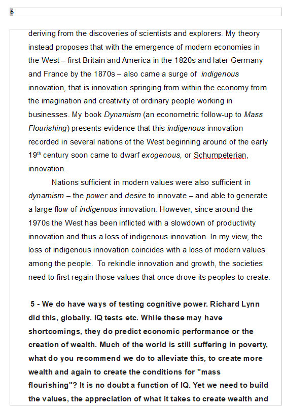 5 - We do have ways of testing cognitive power. Richard Lynn did this, globally. IQ tests etc. While these may have shortcomings, they do predict economic performance or the creation of wealth. Much of the world is still suffering in poverty, what do you recommend we do to alleviate this, to create more wealth and again to create the conditions for "mass flourishing"? It is no doubt a function of IQ. Yet we need to build the values, the appreciation of what it takes to create wealth and prosperity. Please offer your comment.
