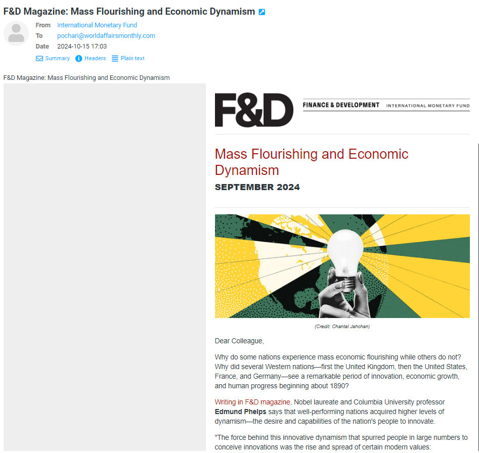 In the first days October 2024 I got an email from the International Monetary Fund, they were sending me the latest issue of their magazine F&D [Finance and Development]. I am on their mailing list, they used to send me physical copies but now they rely on their electronic publishing – which is fine.
