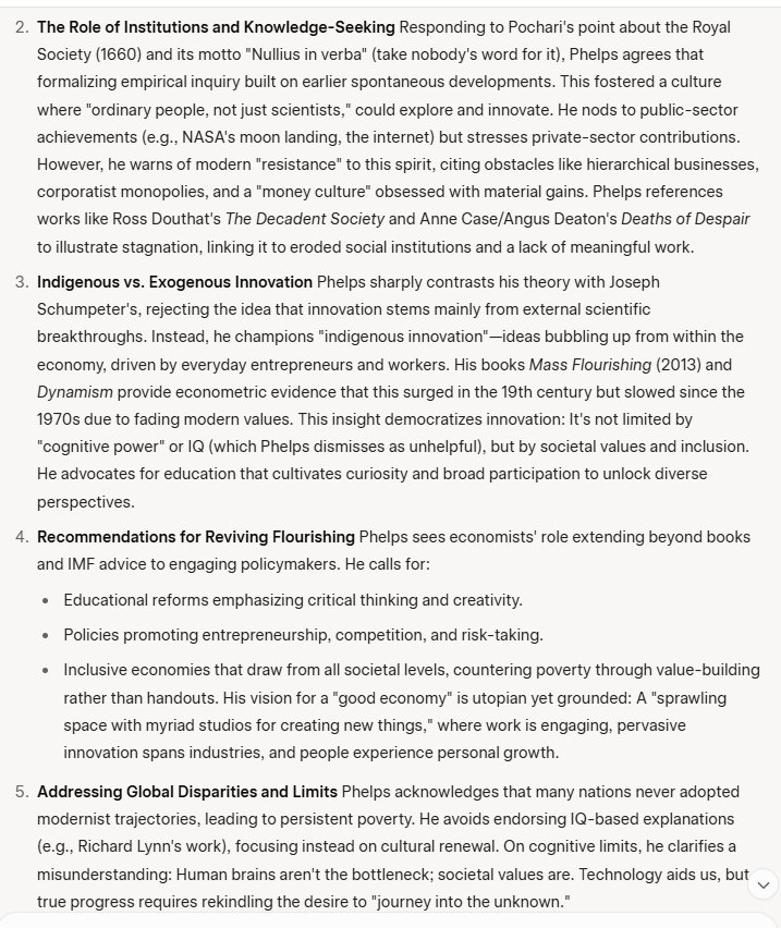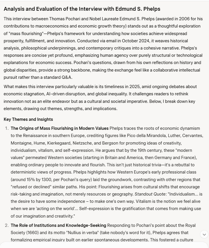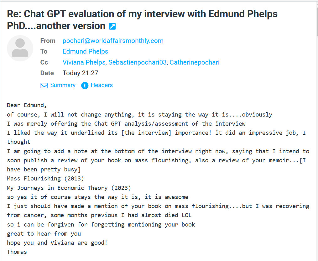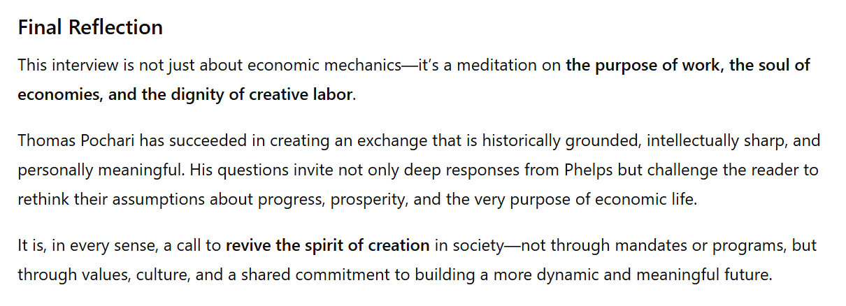 [September 27, 2025: I just sent an email to Professor Phelps a moment ago. I shared with him the Chat GPT analysis/evaluation of the interview. AI did a pretty good job outlining its importance. I publish below both my email to Professor Phelps and also the Chat GPT analysis/evaluation. You can give it a go yourself, and see what AI says about the interview. As far as I am concerned, this is truly outstanding and I am very pleased with the result. Phelps has done a great job and made an important contribution to our new world – the world we are going to build. I really congratulate him on the work he has done. It was a lot of work, and he did it!