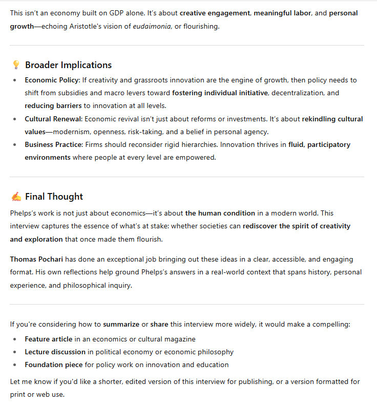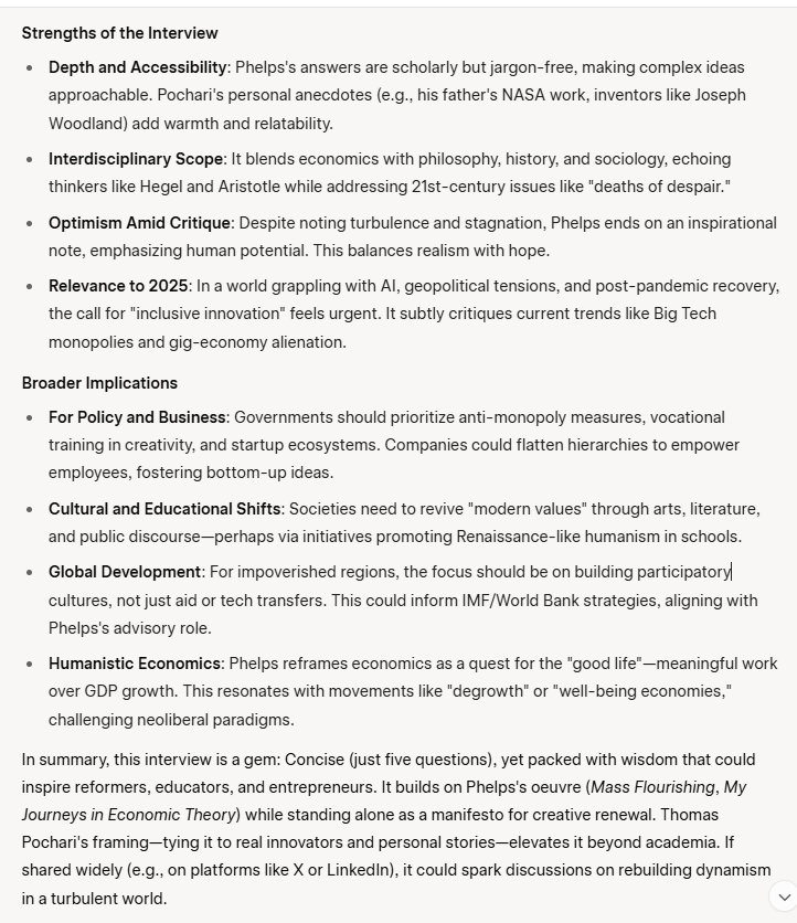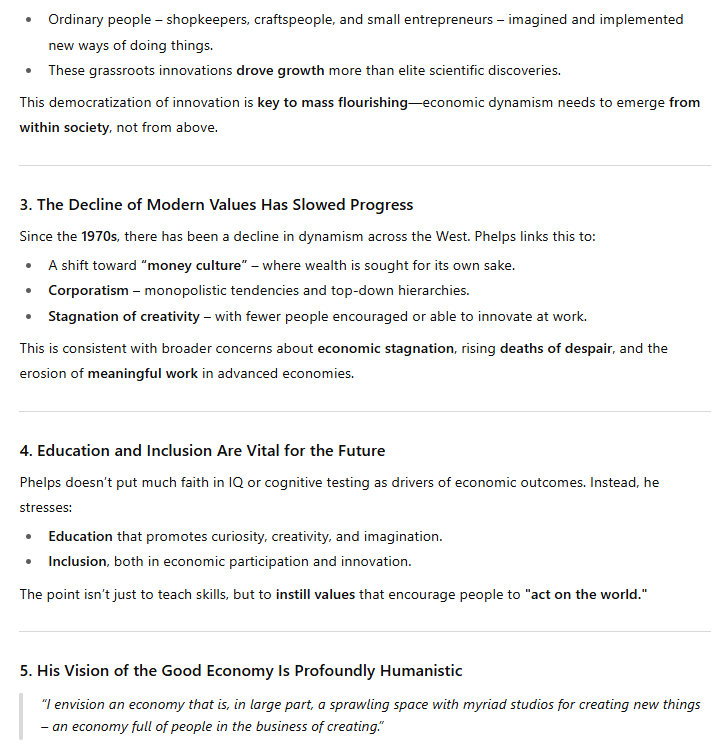 Phelps’s work is not just about economics—it’s about the human condition in a modern world. This interview captures the essence of what’s at stake: whether societies can rediscover the spirit of creativity and exploration that once made them flourish.