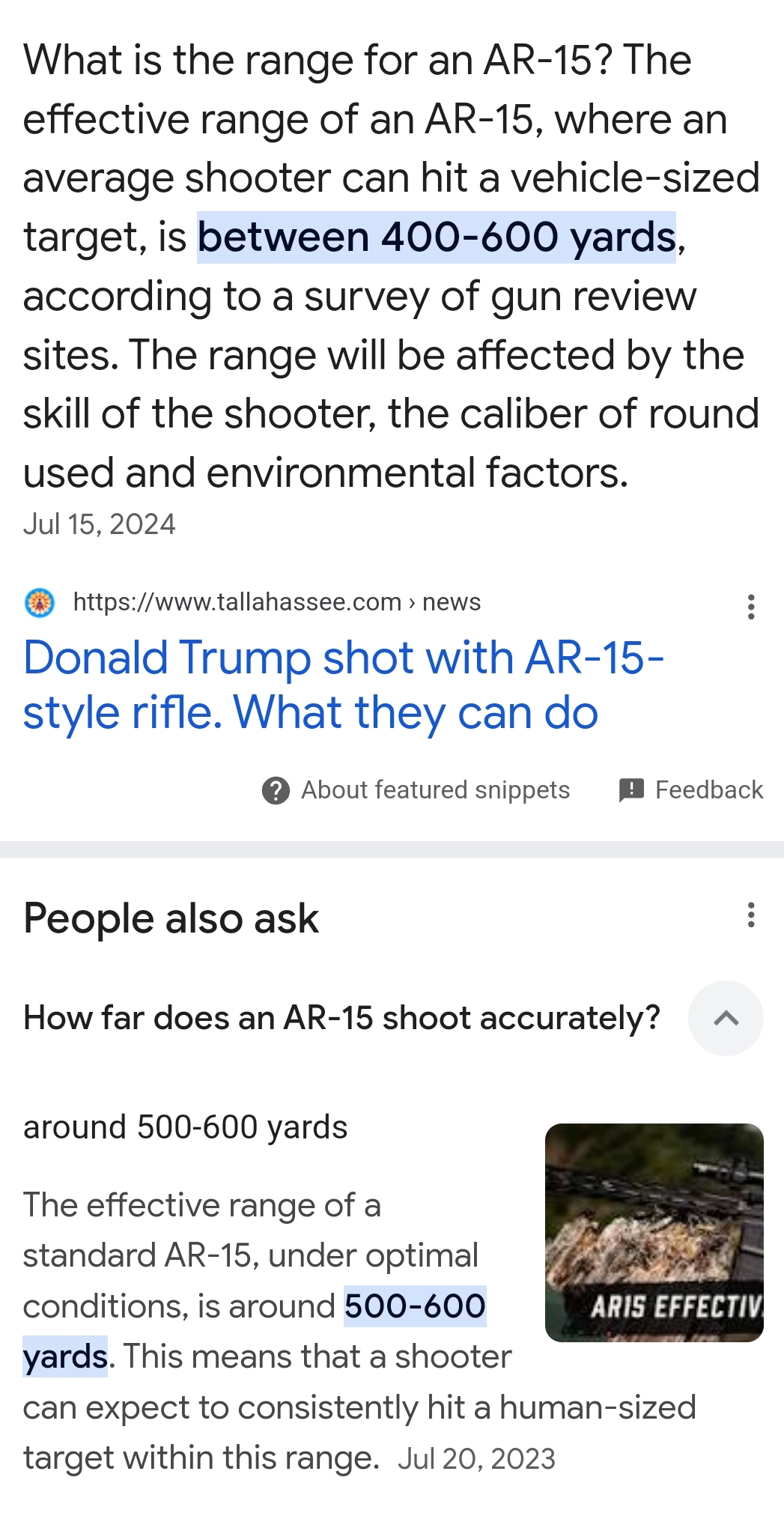 With an AR-15? Perhaps it was an AR-10, my son tells me this is more likely. 10:30 in the morning on May 2, it was very calm, unusally calm, there was virtually no wind. Excellent conditions for a sniper, an AR-15 or AR-10 easily have this capability, at this distance. It was about 400-500 yards, this is no big deal, that's within range, for a trained sniper.