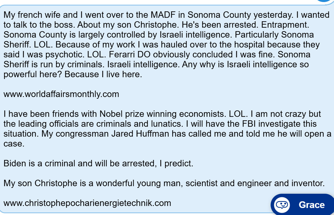These are among the reasons Israeli intelligence has set up camp here in Sonoma County, also in Bodega Harbour. Harassment and espionage, certainly. Often far worse than harassment. My congressman Jared Huffman has recently called me, and said he will open a “case” for me. The FBI has a lot of work to do. Much of the FBI work is directed by Jews, and for the Jewish agendas, but this is now changing.