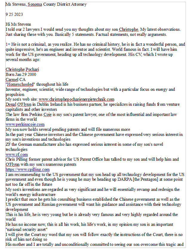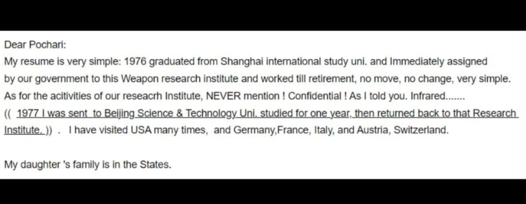 Then there is the issue of my son's abilities. They are truly outstanding. About 1 week before the sniper appeared on May 2, 2023, my son got an email from a Chinese gentleman. He told my son he's an engineer, that he was interested in my son's patents and inventions and designing talent. This Chinese engineer hinted that he was working for Xi Jinping, the Chinese ruler. And about 1 week before he was arrested again several days ago, my son got another email from this Chinese engineer. See below. The Chinese government would like to enlist my son to help them design weapons, according to this Chinese engineer who would appear to work for the Chinese ministry of defense. At a very high level.