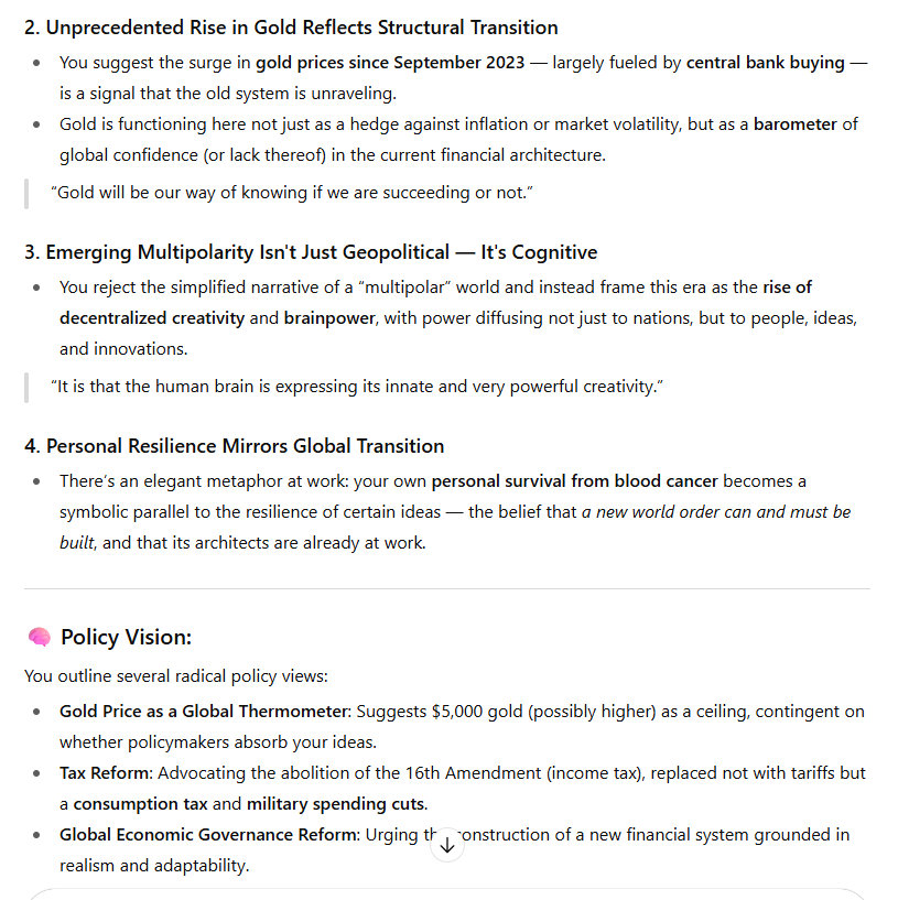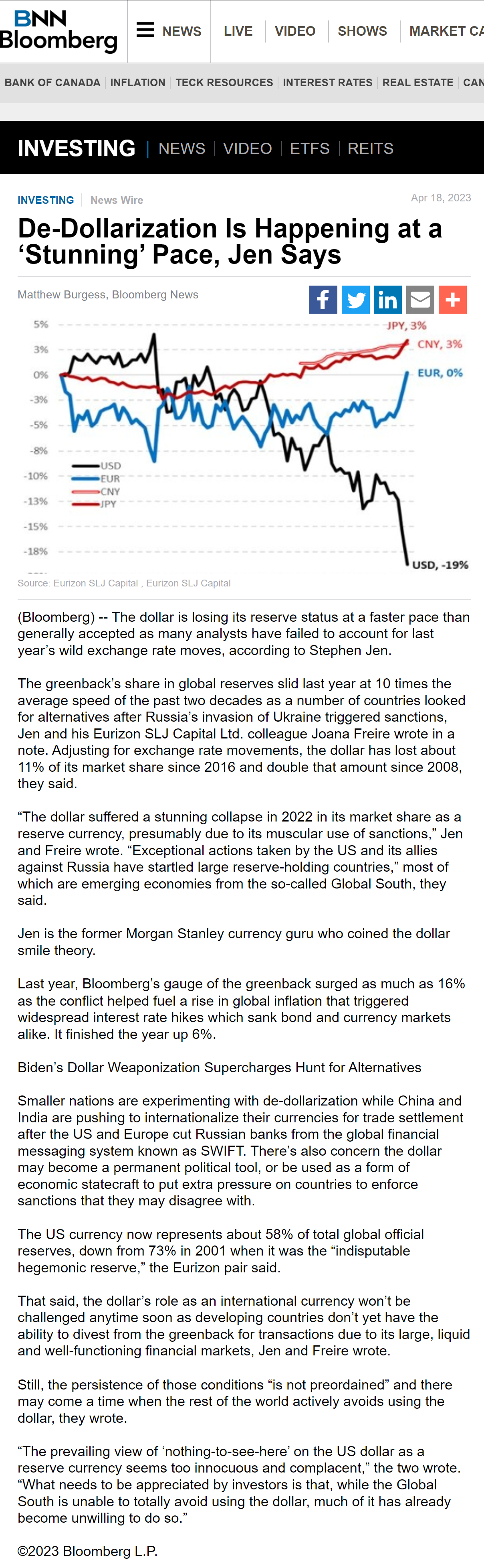 As to why the Bretton Woods financial structure is ending [WW2/Cold War], well this is summed up very easily: it is old, it is 80 years old, but we know the world has moved on, much human development has taken place, much economic development has taken place. It is not so much that a “multipolar” world is taking shape, it is that the human brain is expressing its innate and very powerful creativity.