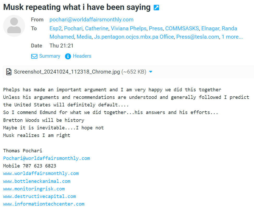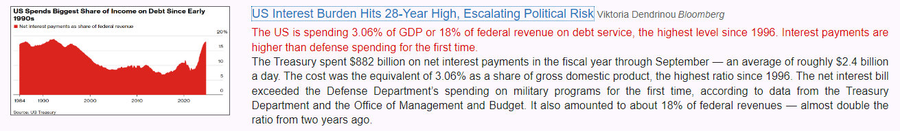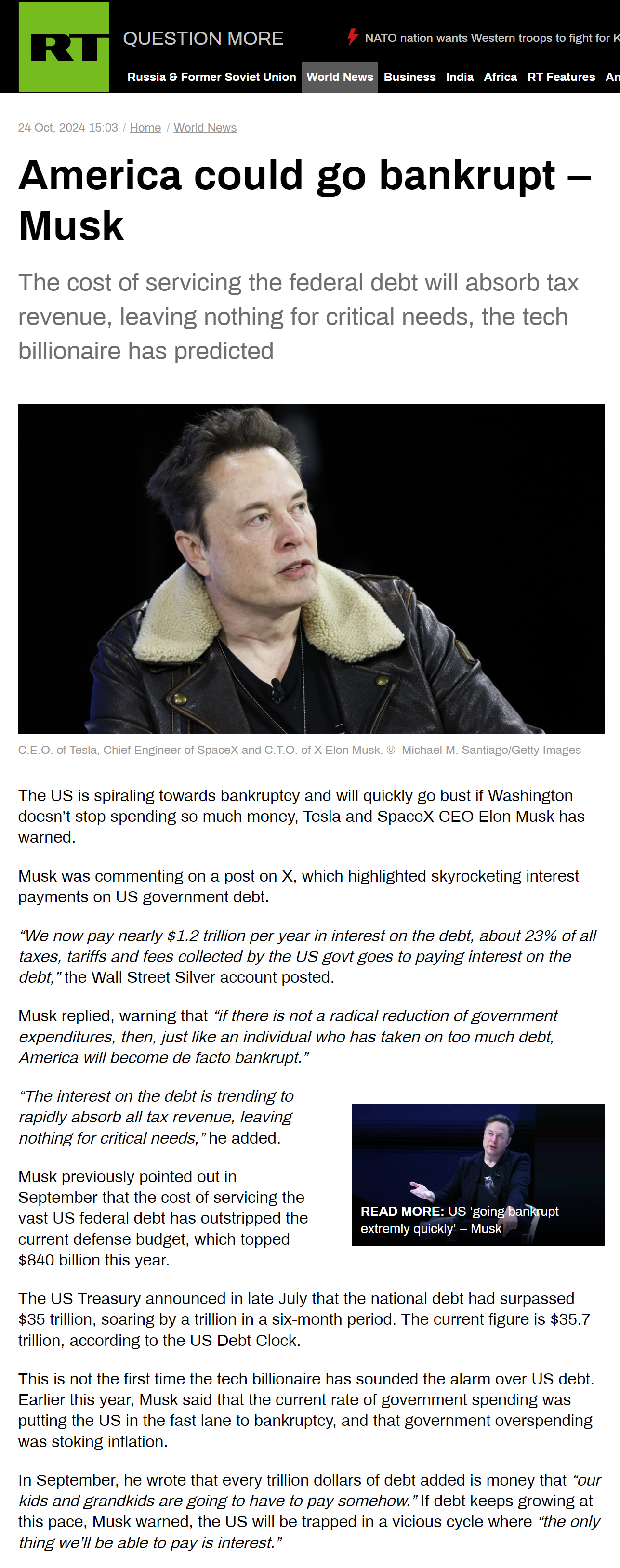 By the way, Elon Musk has realized I am right, so he is speaking about the cost of the US debt as a ratio of federal revenue. I started talking about this in 2015/2016. Donald Trump is talking about deleting the 16th amendment -- the federal income tax -- and this is also something I started talking about more than 10 years ago. I make policy, even global policy, pretty much no one else does. Deleting the 16th amendment is a very powerful policy, but obviously it is going to be very stupid to replace federal income tax revenue with revenue from tariffs. A tariff protocol is retarded and obviously seriously antiquated. Better to reform the US government, cut spending on the insanely costly Pentagon, and propose/establish a modest tax on all consumption.