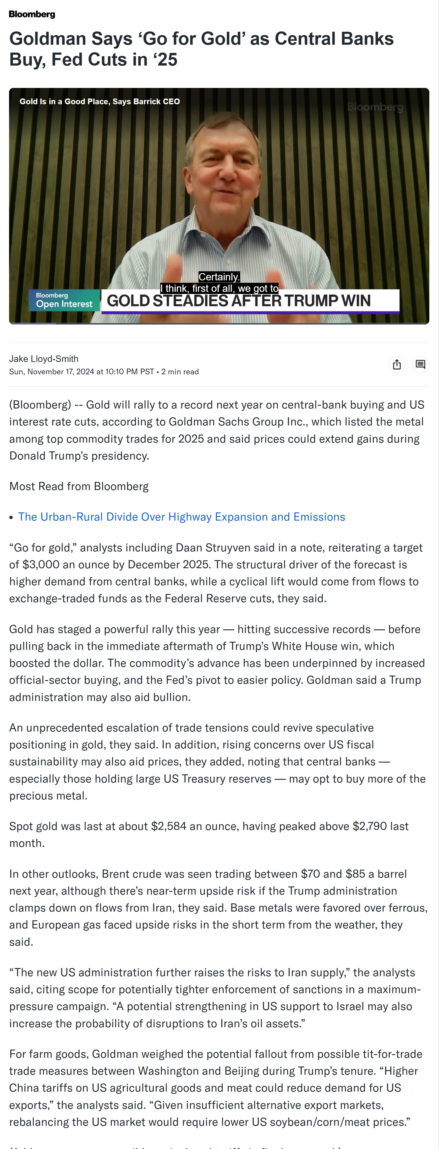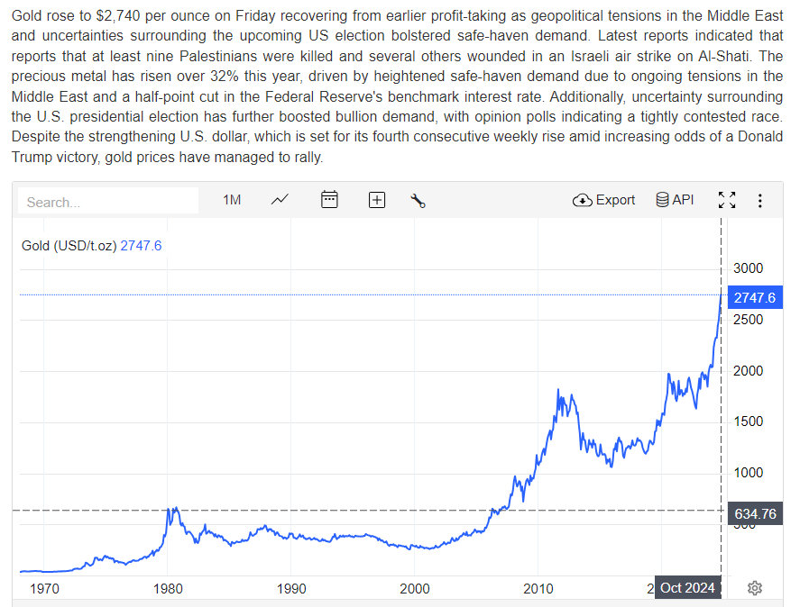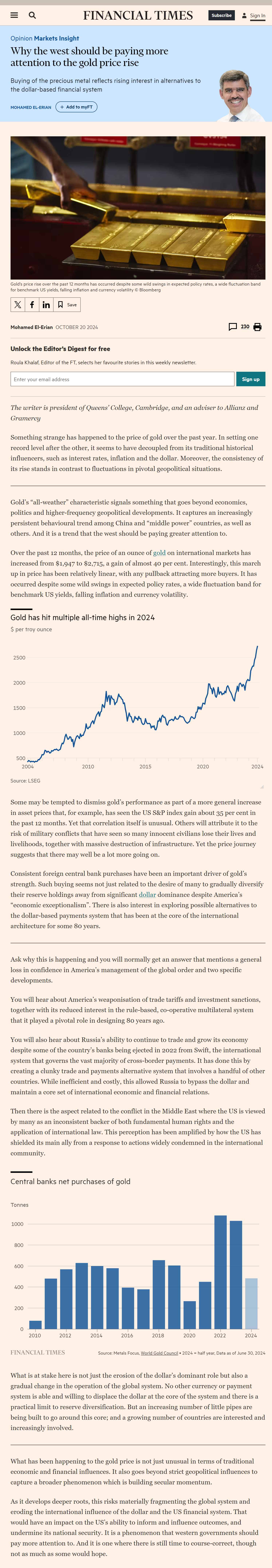 I am not going to die of cancer, my oncologist and doctors tell me. The price of gold has been rocketing since September 2023. This is an unprecedented rise in the price of gold. Who is buying? According to what I understand, this frenzied buying has been mostly fueled by central banks. Investors have been involved, but apparently not to a serious degree. Is this going to continue?