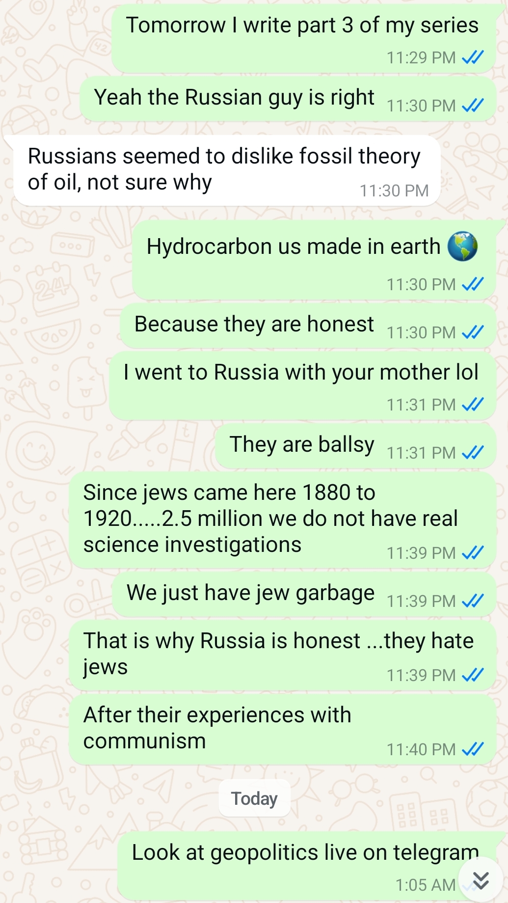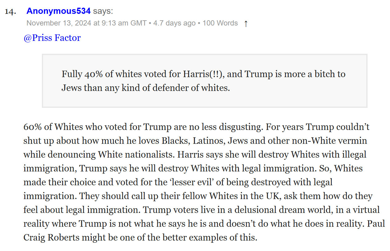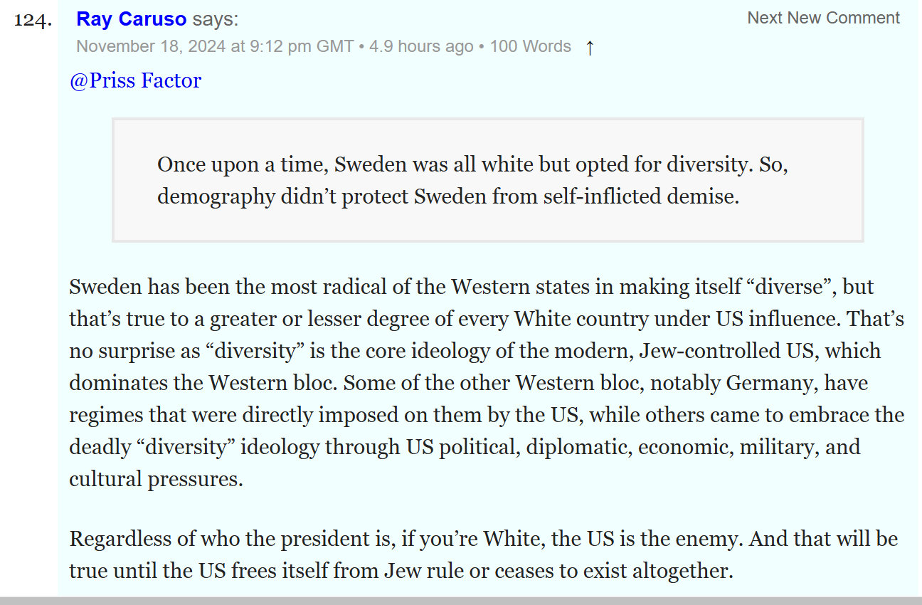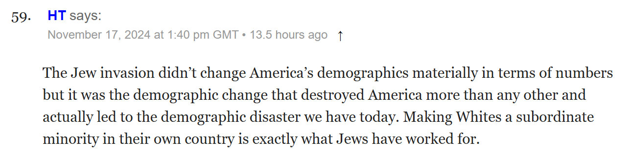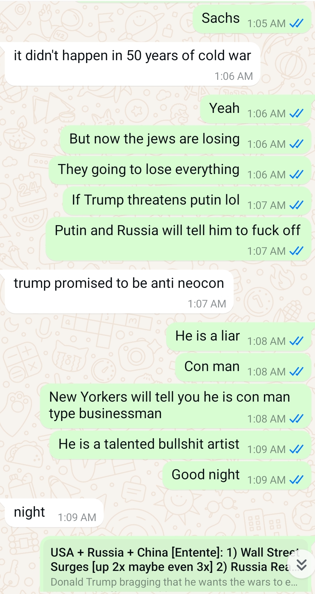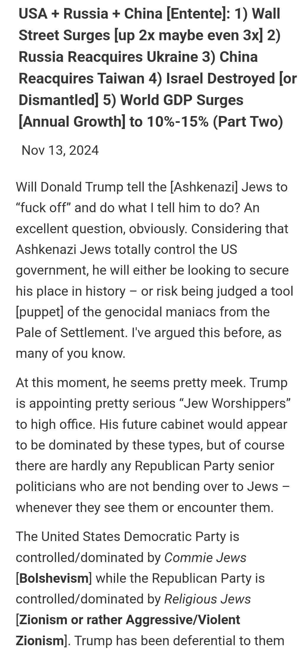 So what is going to happen is that the Ukraine war will not be brought to an end – despite Trump's efforts, noble efforts. Neither will the war in Palestine be brought to an end. The time to kill Jews is coming. It'll be the reverse of what is going on now. Ukraine is being destroyed, and the reason it is being destroyed is because the Jews want to destroy it. They were expecting to occupy Ukraine, turn it into a platform for undermining and destroying the Russian state – as well as Putin. Blinken's mother told me many months ago, when I last talked to her [say it was about one year ago], that “Putin is evil, we've got to get rid of him.” Blinken is Biden's secretary of state.