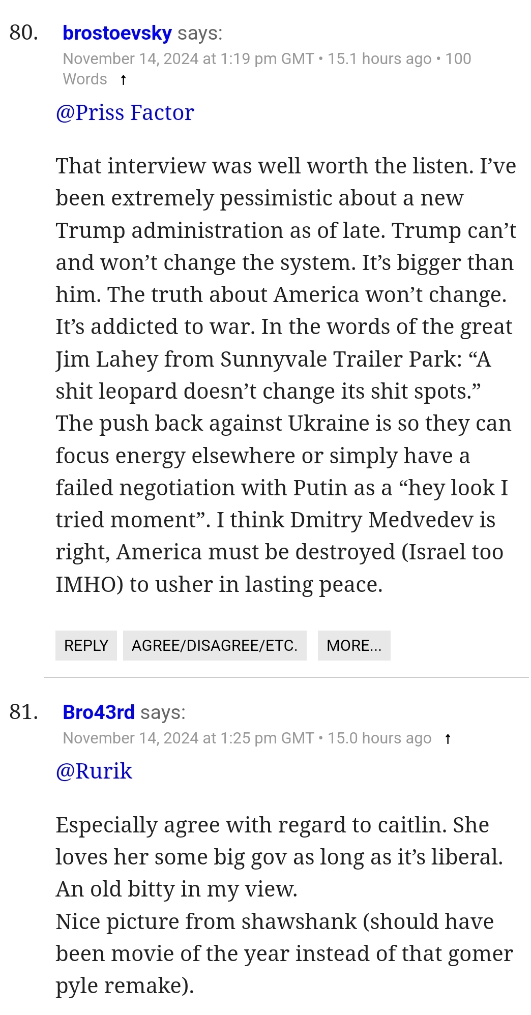 Donald Trump bragging that he wants the wars to end -- “the killing to end” -- is a cute tactic. Does he really want to bring the wars to an end? I doubt it, if he did he would describe in detail the plans for doing so. He is not doing so. Writing the book treatise The Art of the Deal is not going to prepare him for being a statesmen. Bringing “business” ethics to bear on the function of governance is just a joke. Go consult the Greeks on that! Or even the Romans. Rome disappeared and America will disappear, too. This is the advance of history. Obsolescence is obsolescence. This is history, this is the eradication of lower life forms and the advance and domination of higher life forms.
