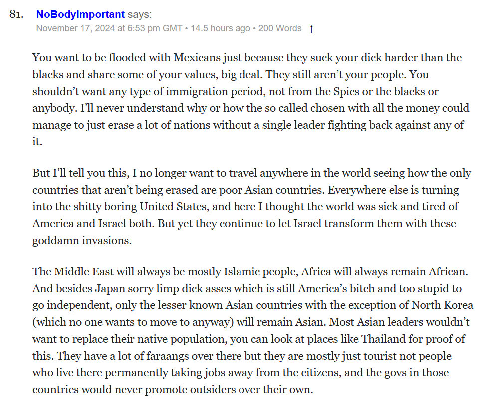 Taiwan is going to be going back to China. Palestine is once again going to be a reality, Israel will be destroyed – or dismantled. This is just nature. There is no other way. This is the ineluctable advance of the homo sapiens. If the United States remains under the control of Jews – as it is now – then the United States of America will be destroyed as well. This is not something to fear, it will be awesome. Liberation from the “Roman Empire” of the modern era is coming, it is inevitable. Thanks to the crazy and criminal Jews, they have brought things to a head.