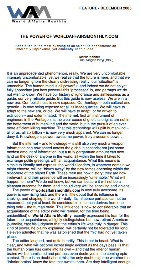 [August 31, 2025: I just remembered my WAM article, published in December 2005. It is titled The  Power of Worldaffairsmonthly.com [published down below, as an image]. I had recently talked to my friend Sander Vanocur, a famous American journalist. I called him an acquaintance in the article, I failed to mention his name then, I was apparently a little scared to do that. But I was referring to what Vanocur told me then. I am not sure when Vanocur told me this, but it was probably 2003-2005. He said he was surprised that I was still alive. He said I was so powerful and influential it was shocking.