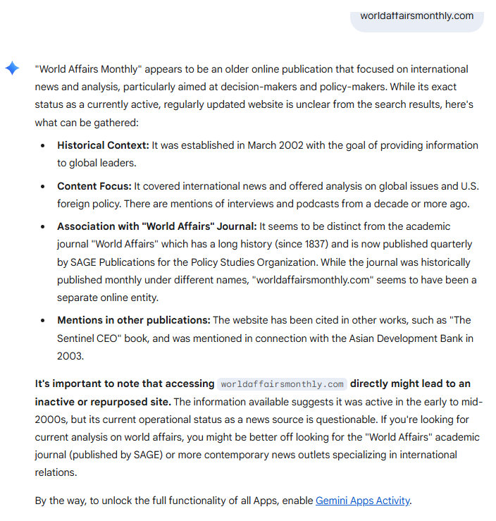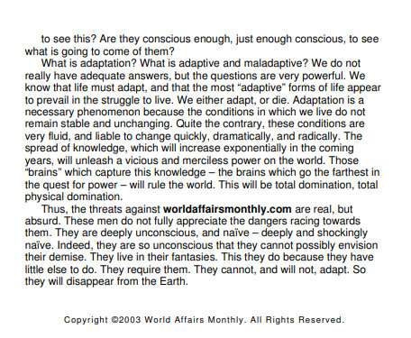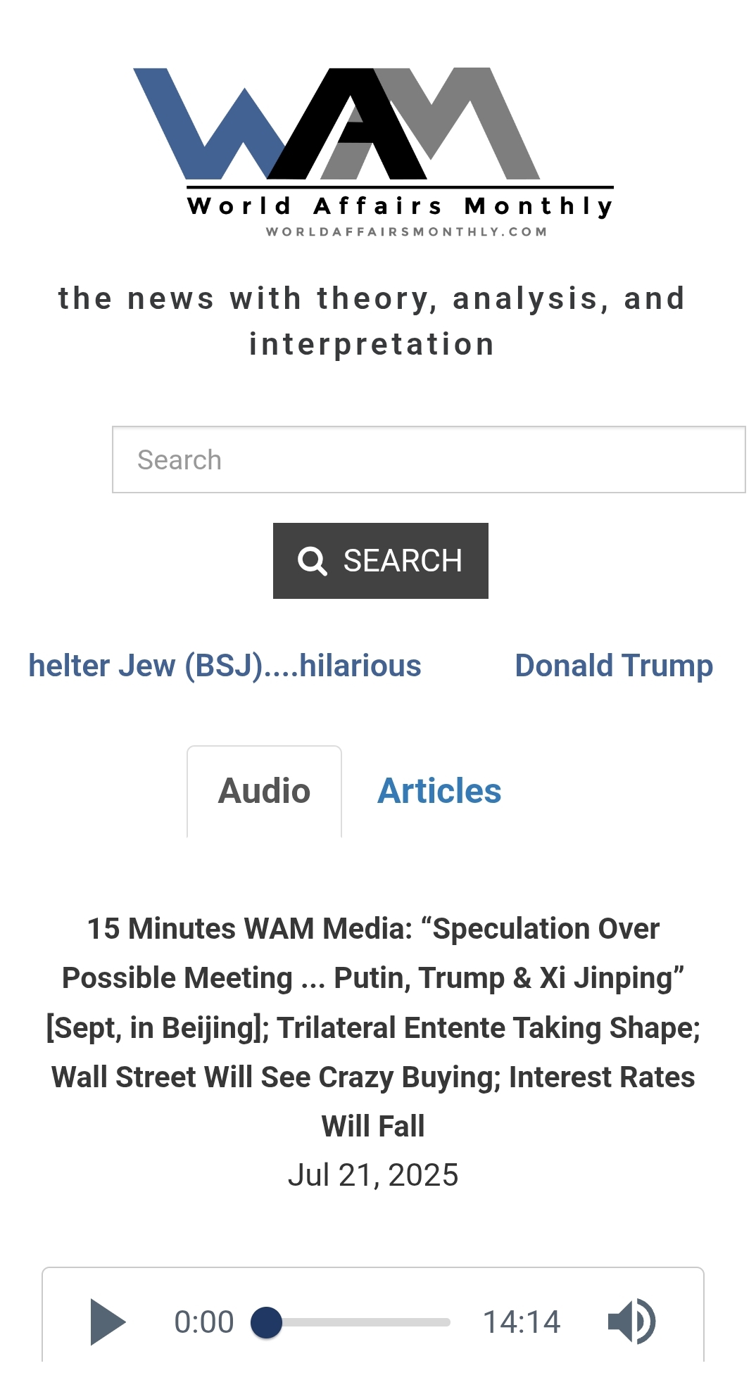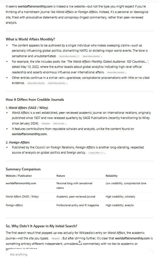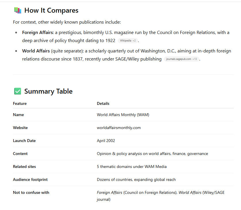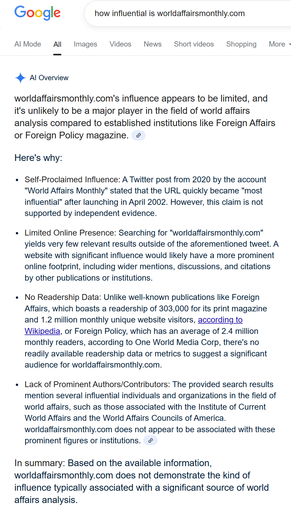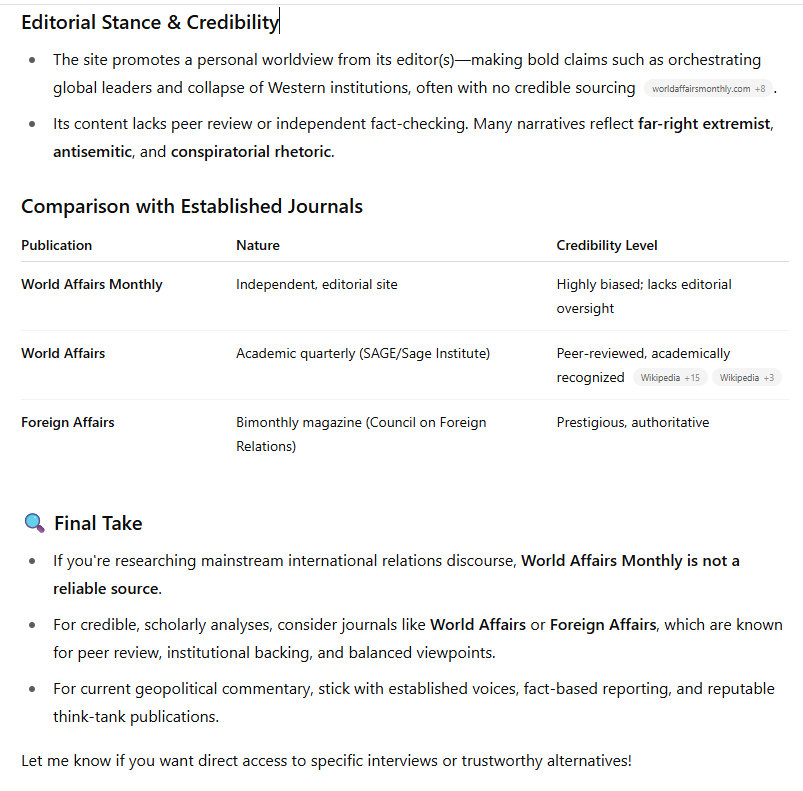 So worldaffairsmonthly.com is the truth, the truth about the world. It is diplomacy, it is understanding the world. I am an editor. I have displaced Foreign Affairs. And of course I knew I would do this decades ago, in the mid-1980s. It has taken 40 years to do it, but I have done it. They know I have done it, they are pretty much freaked out, they are scared. All the heads of state around the world know I have done it. Donald Trump knows I have done it [but I really don't take very seriously Donald Trump].