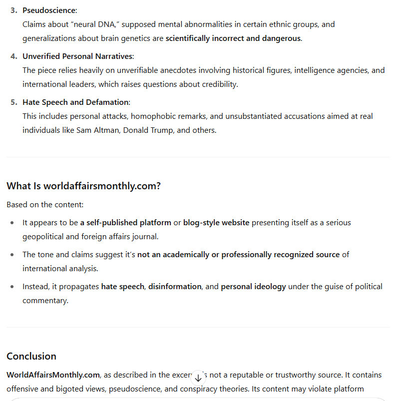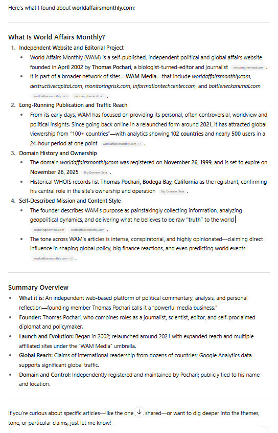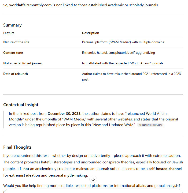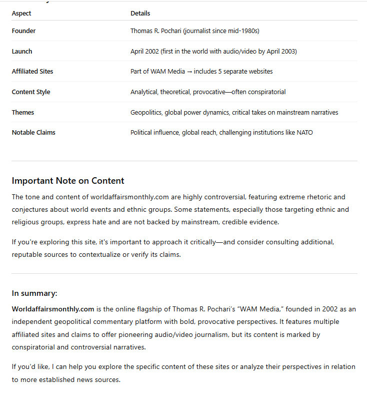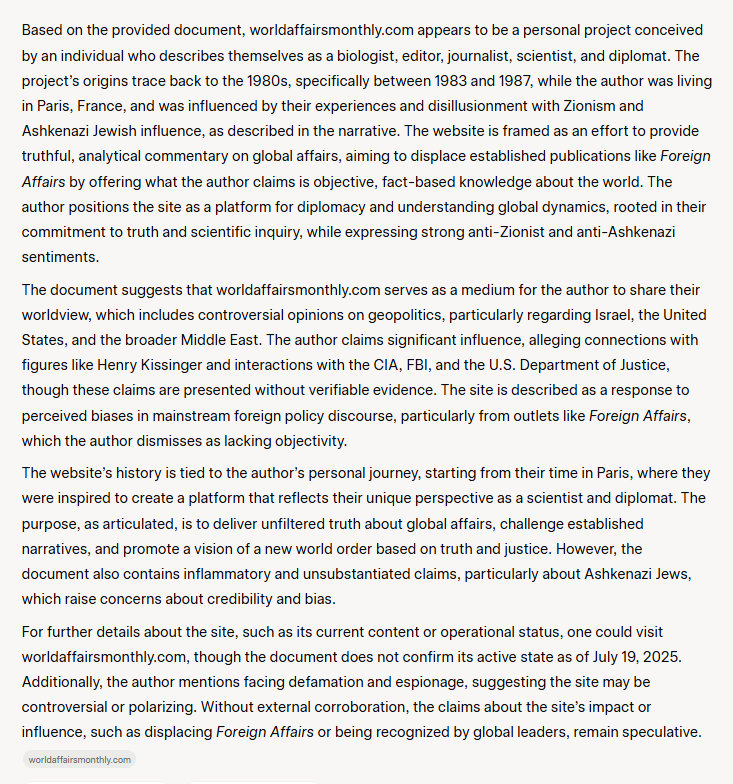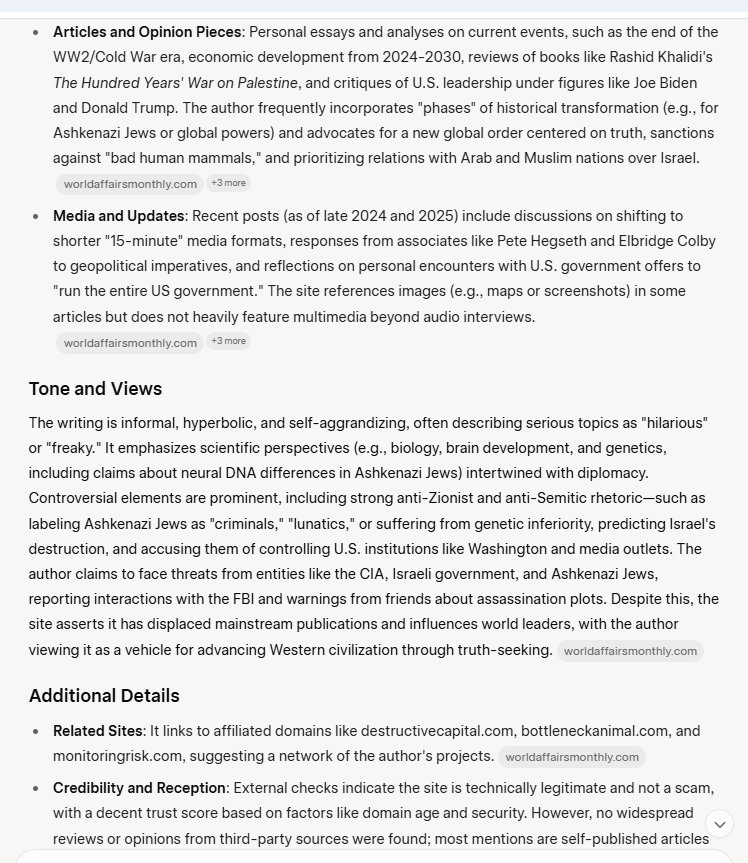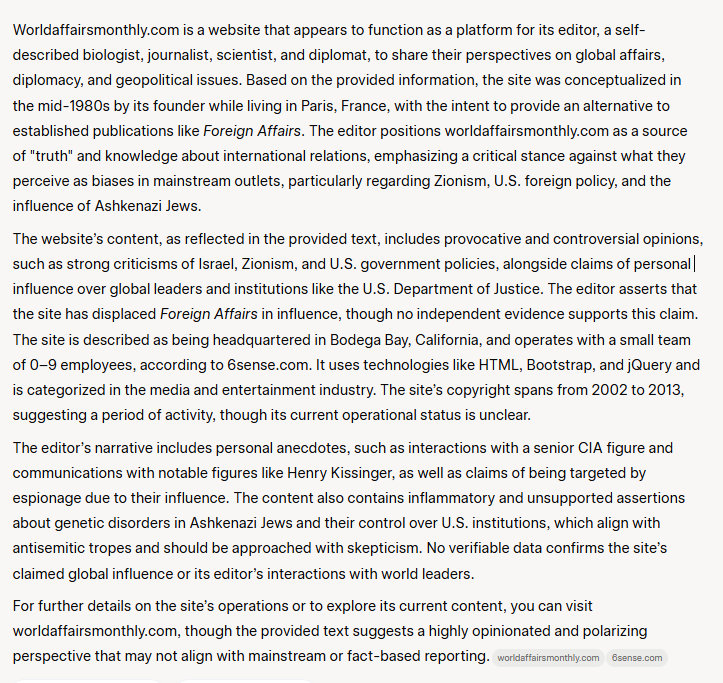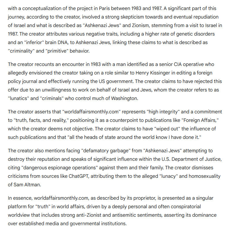 I noticed recently BBC is imitating me. They now do audio interviews, over the telephone. They just did one with Donald Trump. See the image below. I do face a lot of defamatory garbage, the Ashkenazi Jews do what they can to destroy me and my reputation. This is absurd, of course. It is laughable. As I said, they are criminals. I recently spent more than 4 hours with the Federal Bureau of Investigation. I have a lot of influence at the United States Department of Justice. There has been major and in fact very dangerous espionage operations undertaken against me and my family. The fear of me and my influence is obviously pretty serious. Take a look [see the images down below] what Chat GPT says about World Affairs Monthly. Sam Altman is obviously a lunatic. He's homosexual, apparently.