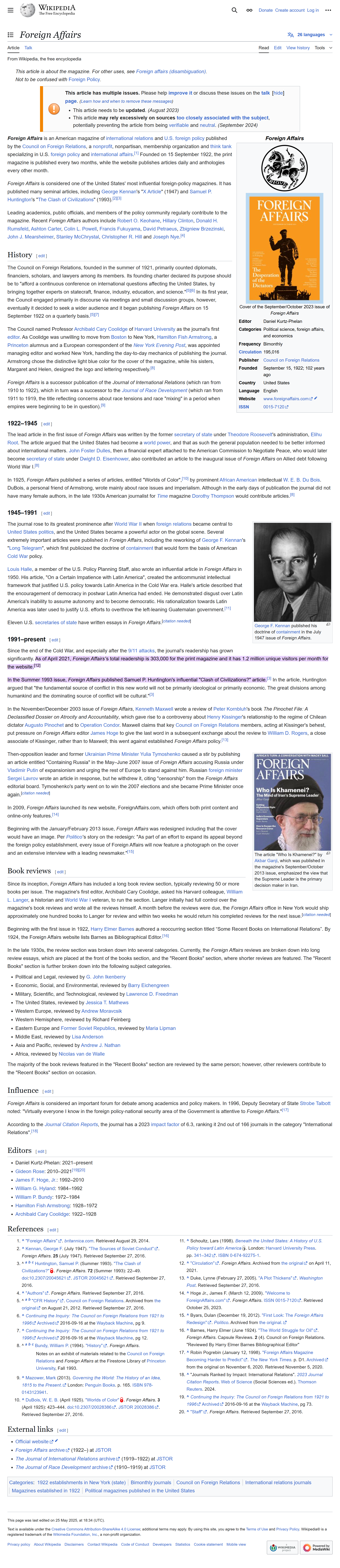 Foreign Affairs is pretty close to being a joke. There are a few others, but they are not serious. I have pretty much wiped them out, meaning they no longer have any serious influence. The publishers of Foreign Affairs wanted me to publish a competitor to Foreign Affairs. They made a serious proposal to me in 2000. I remember sitting in my home in Bodega Bay, with my wife, and talking to a gentleman who had been dispatched to my home to make the offer. It might have been 2001. I think it was before 9 11.
