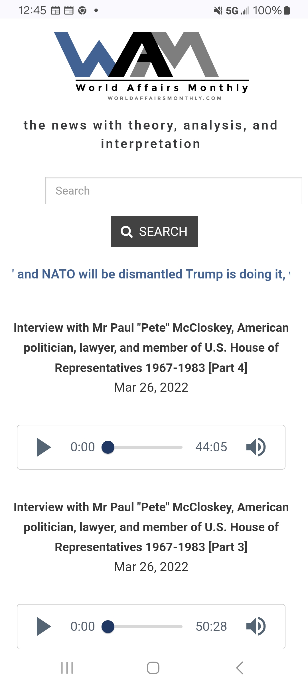 [September 1, 2025: Sander Vanocur was really serious about what he told me, of course. I am not exaggerating. Vanocur and I were good friends, as I mentioned. But I almost forgot to mention two other men, and their comments to me, about the threats I face. Pete McCloskey and I were good friends for about 23 years. McCloskey (September 29, 1927 – May 8, 2024) was a member of Congress from 1967 to 1983. He was a Republican. He was close to George HW Bush, also George W Bush. I drove over to Pete's home in Winters, in the central valley of California, on 26 March 2022. I did an interview in person. Published at worldaffairsmonthly.com. Pete unfortunately was slurring a lot when he spoke, and that was of course because of the stroke he was recovering from. His speech was slurred, but he was very sharp.