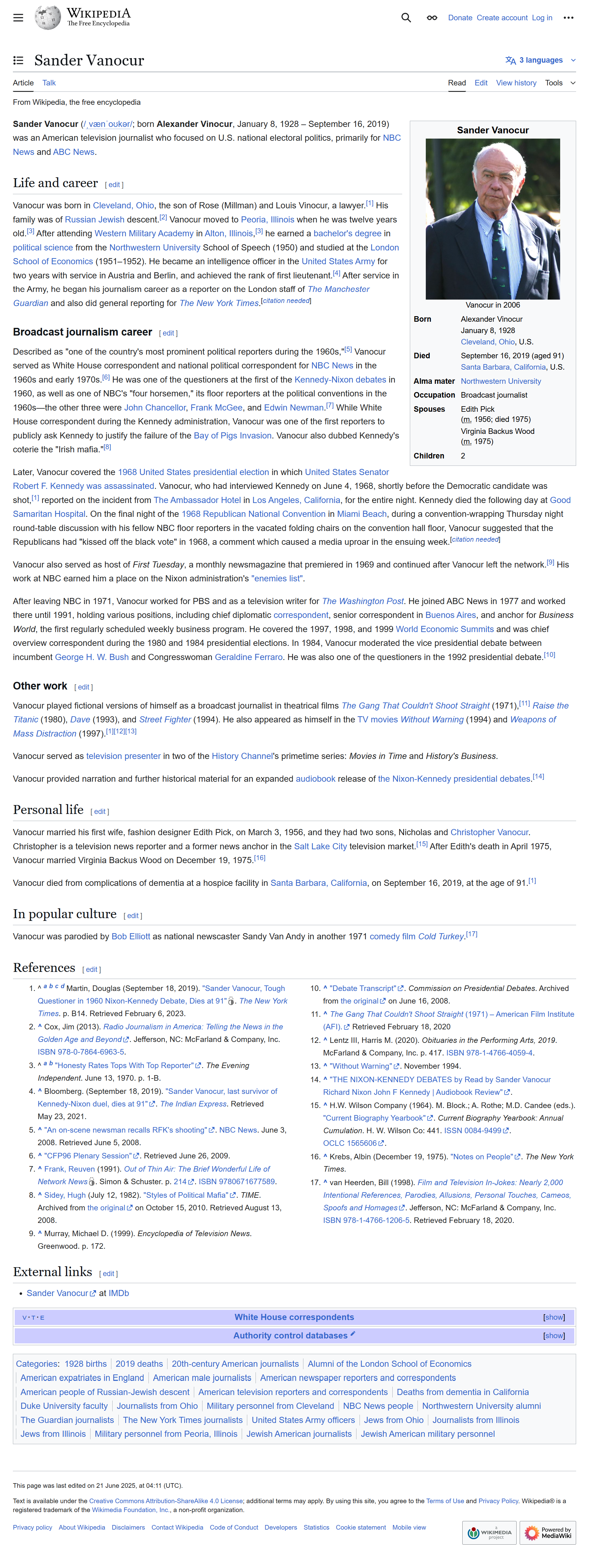 "(Vanocur is) described as 'one of the country's most prominent political reporters during the 1960s,' Vanocur served as White House correspondent and national political correspondent for NBC News in the 1960s and early 1970s."
